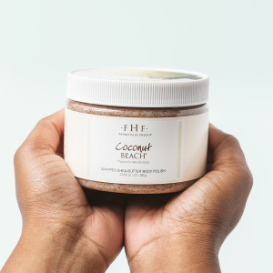 EXFOLIATE: First, remove rough skin with our delicious Coconut Beach® whipped shea butter body polish. This creamy, gentle cleanser whips up on skin, exfoliating with sugar and apricot seed powder, while moisturizing with shea butter and coconut water. It’s like a trip to the islands with every scoop.