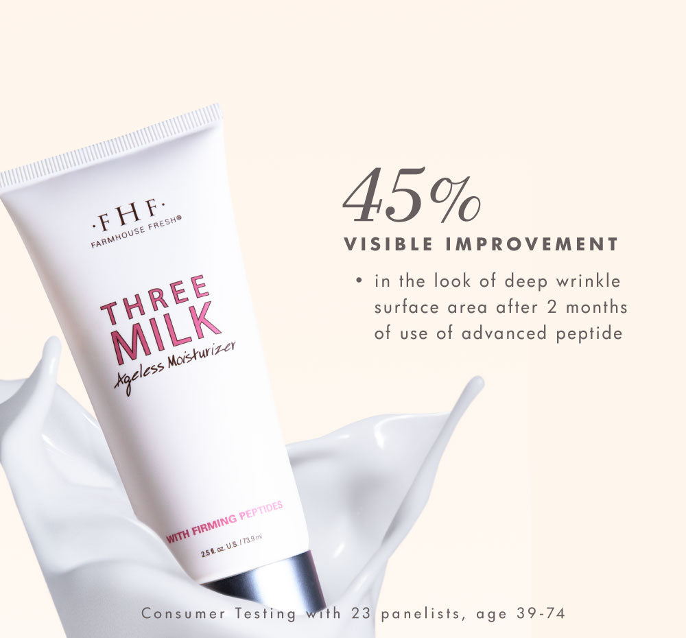 MOISTURIZE: Say farewell to the look of fine lines, thanks to Three Milk™ Ageless Moisturizer! This blend of wrinkle-banishing peptides, coconut milk and milk thistle calms unevenness for one flawless appearance! One of our most-loved products.