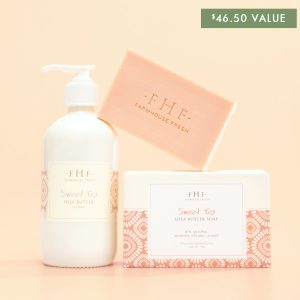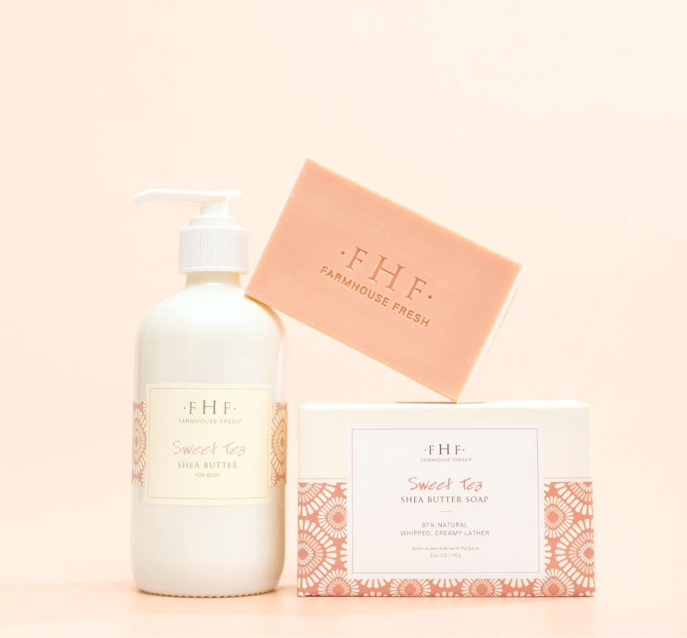 Deeply Nourish:Southern Living Magazine crowned our Sweet Tea Body Polish its Best of Beauty Award Winner, and we couldn’t resist a peachy, creamy shea butter to match. This rich moisturizing cream is a house-made spa butter blend of shea butter, vitamin E, and omega-6 rich U.S.-grown non-GMO soybean oil to calm even the severest of dry skin, without a hint of a greasy feel! Scented like a southern sweet tea with peach, ginger, and white tea. Blended with our FHF-grown heirloom organic cucumber extract with soothing antioxidants.