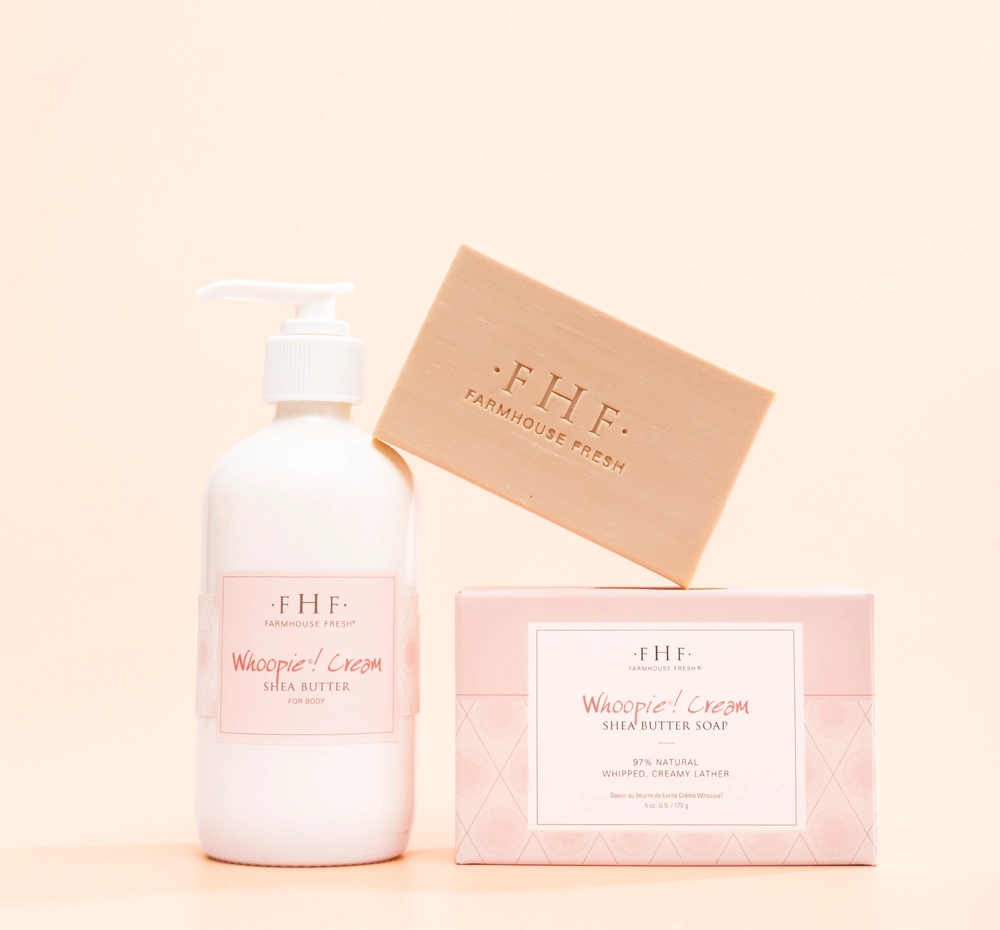Deeply Nourish:This rich moisturizing cream is a house-made spa butter blend of shea butter, vitamin E, and omega-6 rich U.S.-grown non-GMO soybean oil to calm even the severest of dry skin, without a hint of a greasy feel! Lightly scented with scrumptious white velvet cream and moist layer cake inspired by the famous comfort desserts – Whoopie Pies. Blended with our FHF-grown heirloom organic cucumber extract with soothing antioxidants.